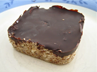 5. Melt chocolate in a double boiler, add a bit of honey to sweeten. Pour the chocolate mixture on top of the already pressed down bars. Smooth out and place into the fridge or freezer until chocolate has hardened. To serve, take bars out of fridge/freezer for at least 30 minutes.